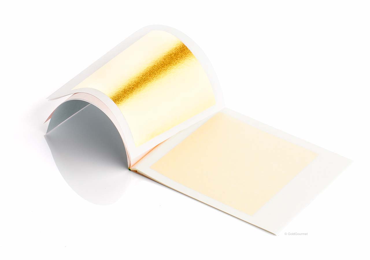Aur comestibil (23 K) în foita transferabila, FIXATA pe suportul de protecție.